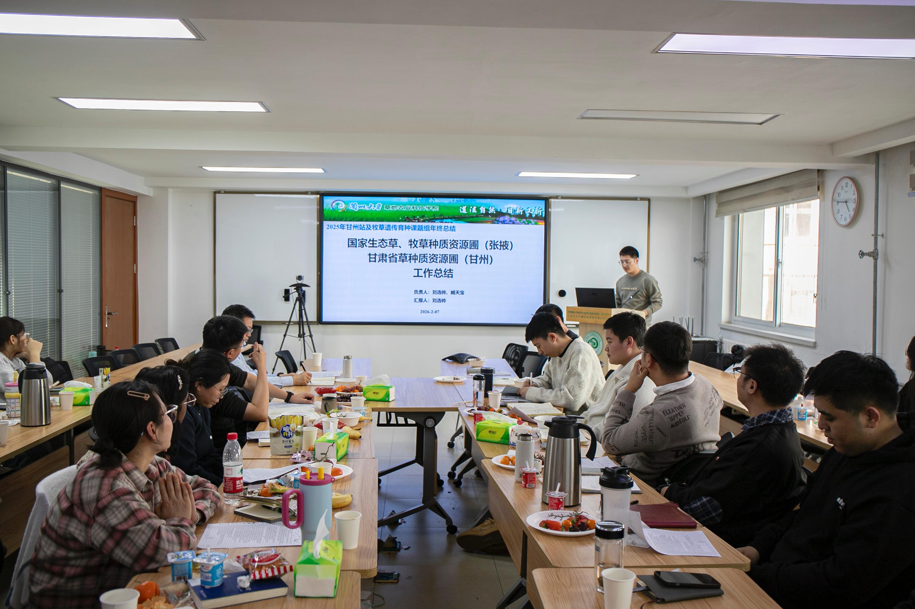 2026年2月7日下午,国家生态草、牧草种质资源圃(张掖)暨甘肃省草种质资源圃(甘州)2025年度总结会于兰州大学草地农业科技学院步云楼308会议室召开。张吉宇教授及在甘州圃开展研究师生30余人参加了此次活动。刘选帅代表两个资源圃平台作了总结汇报。刘选帅就资源圃的发展历程、基础设施、种质资源种植保存、参观交流及承担任务情况作了详细汇报。期间,针对资源圃的管理和2026年的规划,全体师生进行了深入讨论交流。最后,张吉宇教授做了总结发言,表示种质资源圃是种业创新的基础设施,要继续管理好资源圃,高标准完成2026年的国家圃和省级圃项目工作。